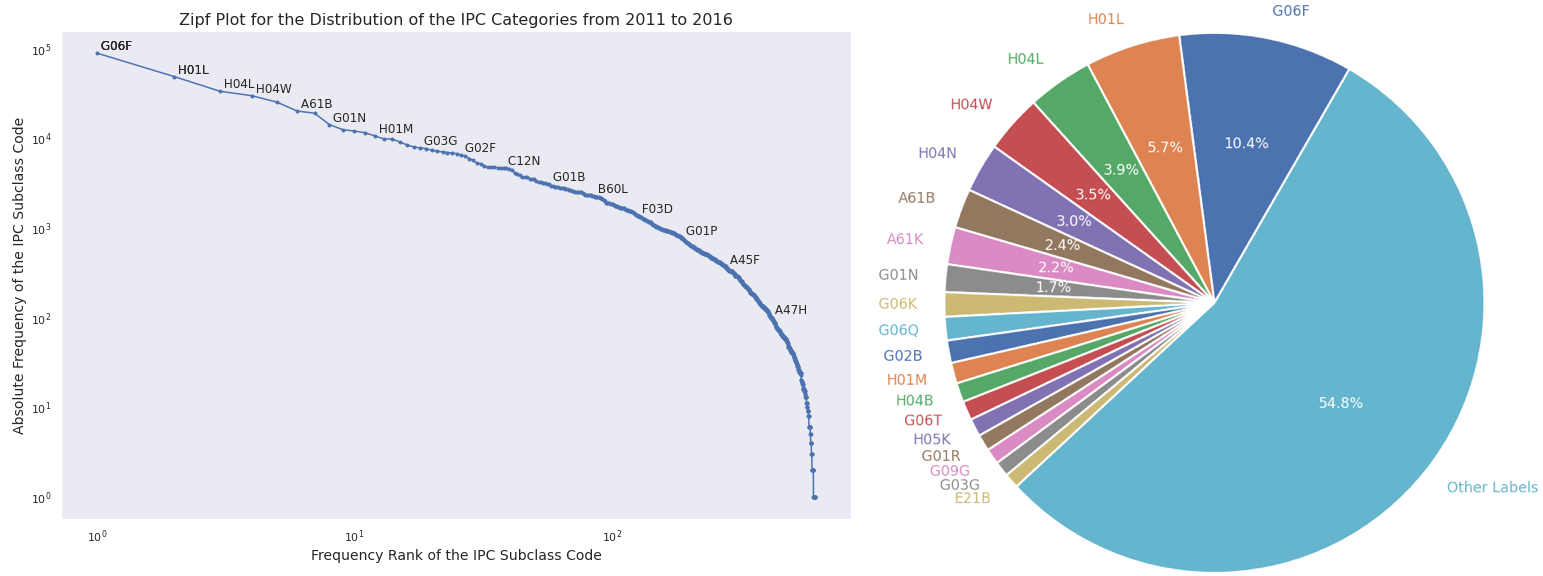 IPC distribution of accepted patent applications from 2011 to 2016 at the IPC subclass level. There are 637 IPC subclass labels in HUPD, of which the most common 20 codes make up half of the distribution. G06F-Electric Digital Data Processing is the largest IPC subclass, accounting for 10.4% of applications.