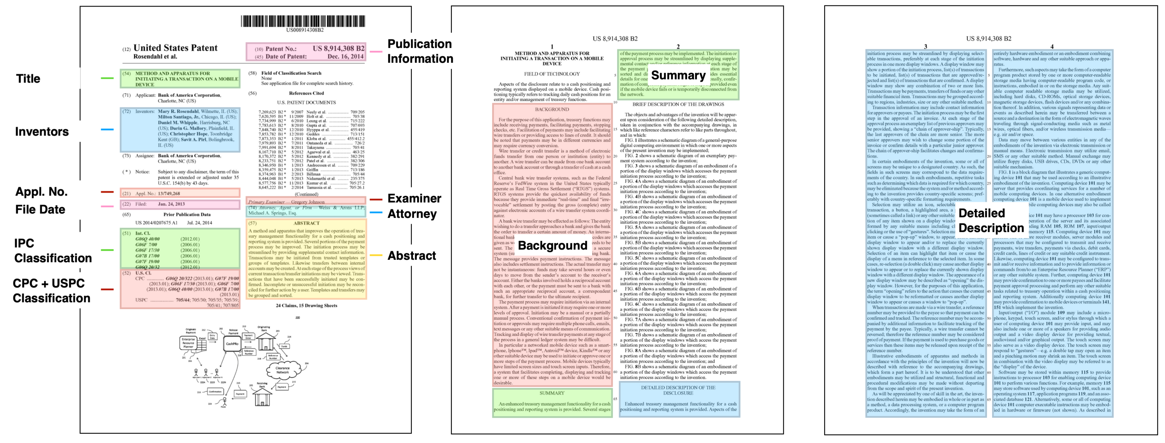 Three pages of the pre-grant version of an example patent document (Method and Apparatus for Initiating a Transaction on a Mobile Device [Publication No: 2014-0207675 A1]). The highlighted sections show a subset of the 34 data fields that we include in the Harvard USPTO Patent dataset.
